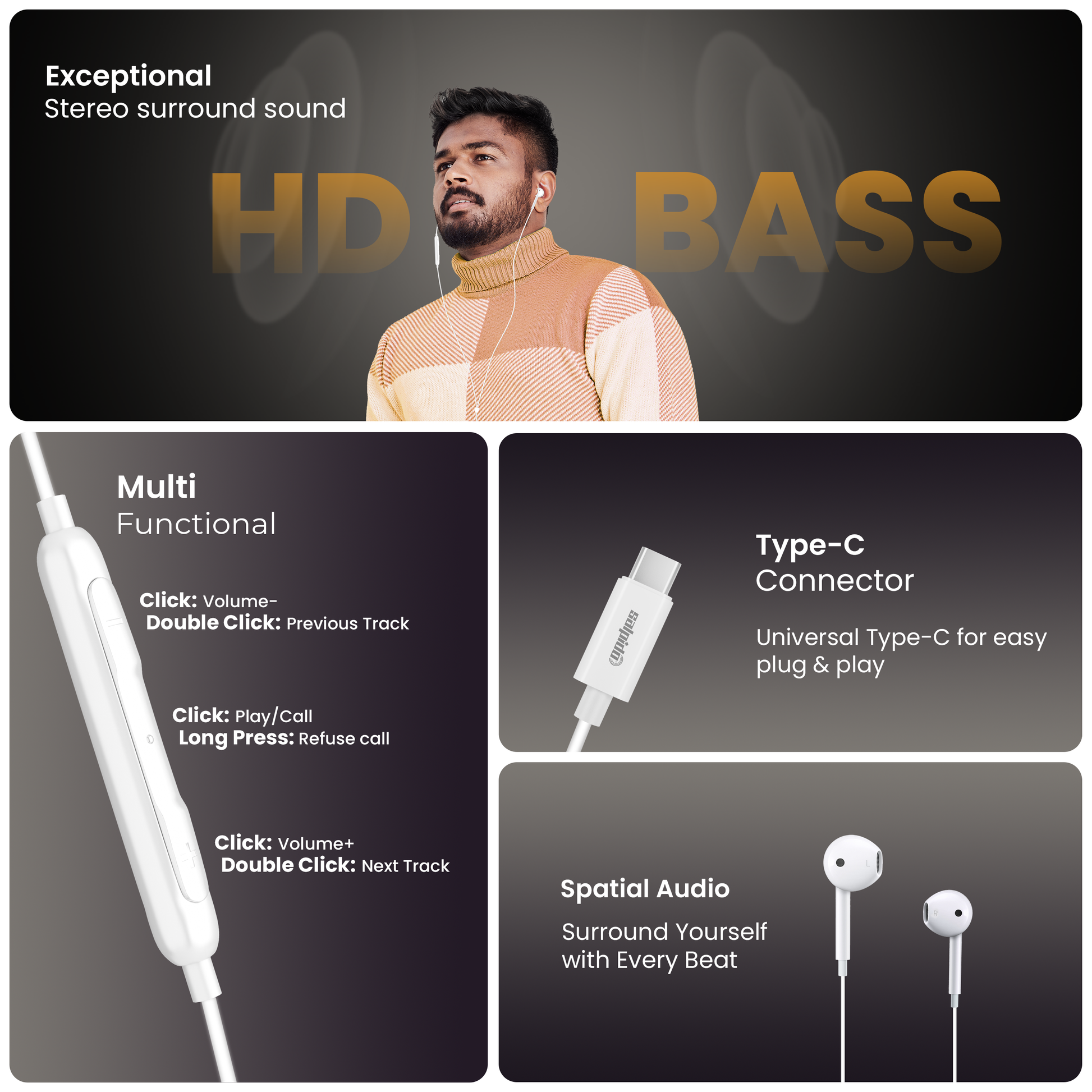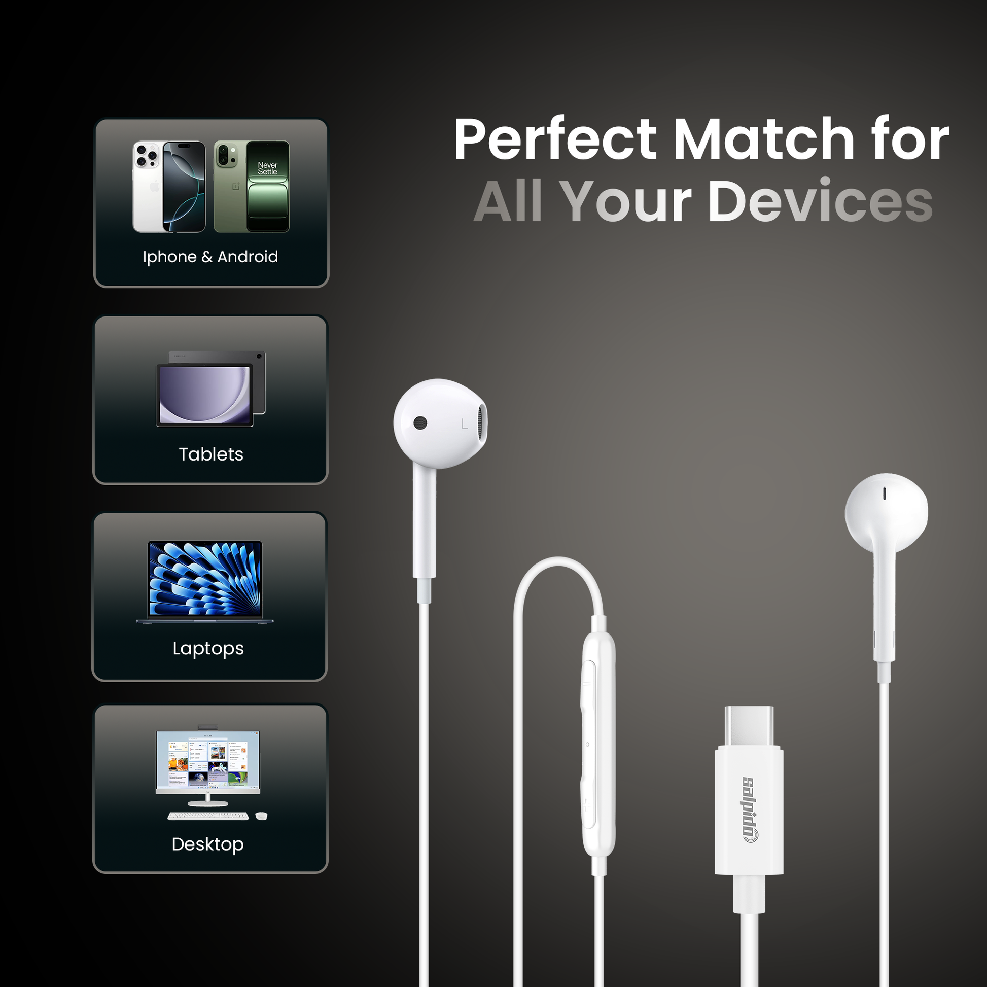 Type-C Wired Earphones with 10mm Driver, Inline Volume Control, Mic & 1.2M Cable