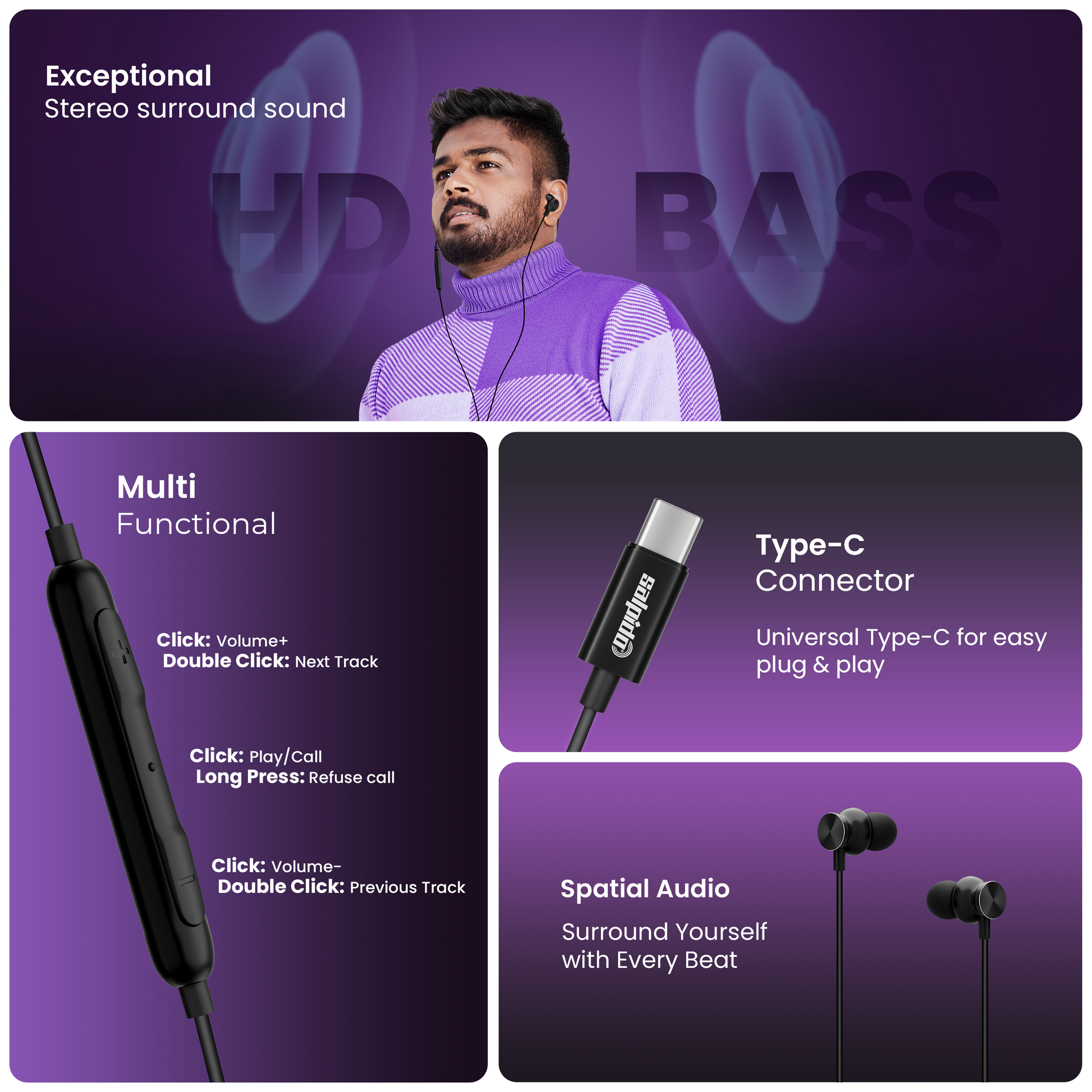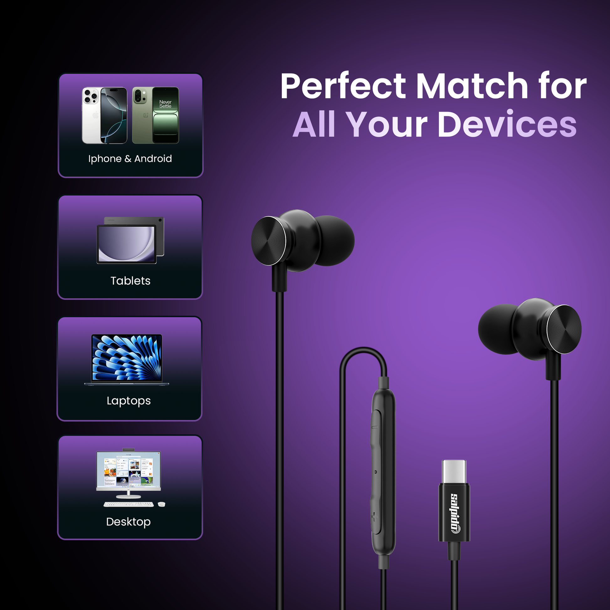 Type-C Wired Earphones with 10mm Dynamic Driver, Hi-Fi Spatial Audio & 1.2M Cable